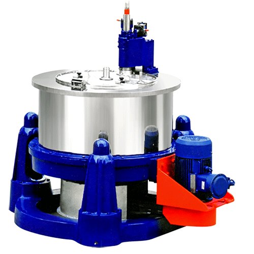 待分离的物料经进料管进入高速旋转的离心机转鼓内,在离心机力场的作用下,物料通过滤布(滤网)实现过滤,液相经出液管排出,固相则截留在转鼓内,待转鼓内滤饼达到机器规定的装料量时,停止装料,对滤饼进行洗涤,同时将洗涤液滤出,达到分离要求后,离心机低速运转,操作手动刮刀装置,通过先将刮刀径向切入,再轴向刮料,将转鼓中的滤饼刮下,刮刀装置复位,完成一次工作循环。